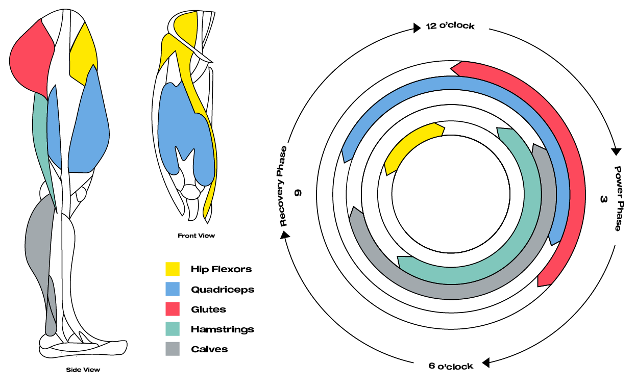 The Pro Cyclist Large, rounded, symmetrical. This rider activates their full muscle chain, quads pushing down, hamstrings and hip flexors pulling through and up. Power flows rather than punches. Minimal dead spots. Maximum efficiency. This is what we're building toward.