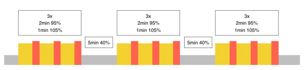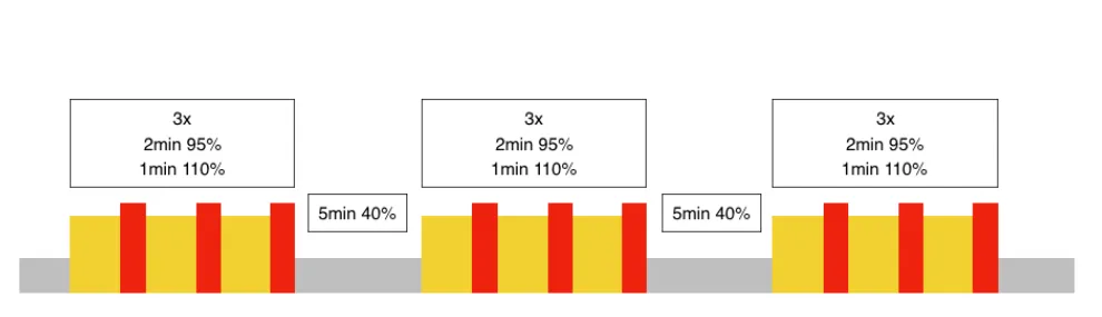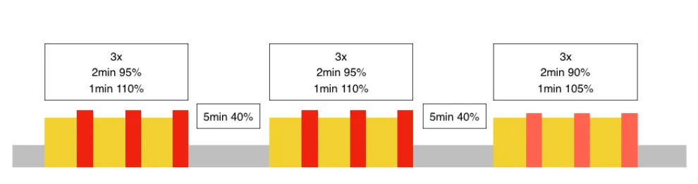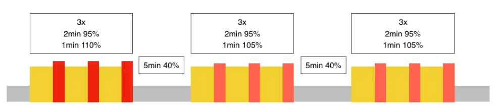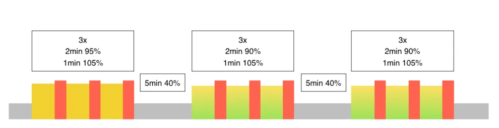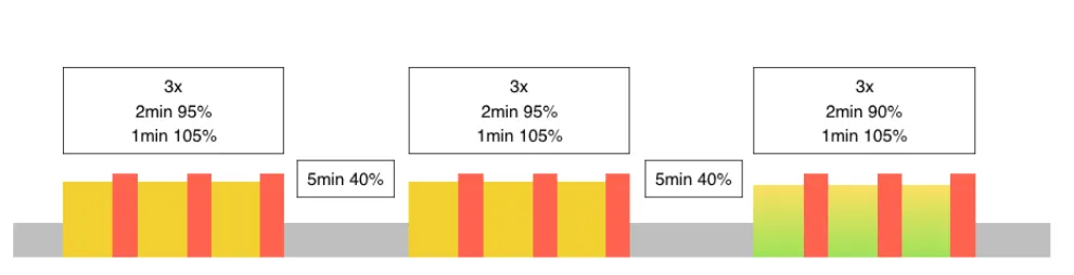 Once you have become comfortable increasing the 'unders' intervals, we then do the same process with the overs. We will gradually push them towards 110% of FTP across all three blocks, increasing one block at a time.